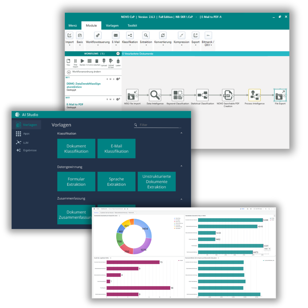 Mit der Low-Code-Plattform NOVO CxP modellieren Sie Workflows ganz einfach selbst – auch ohne tiefgehende IT-Kenntnisse. In Kombination mit der KI-Lösung NOVO AI Studio machen Sie eine vollständige Prozessautomatisierung in Ihrem Unternehmen möglich. Und den vollständigen Überblick über Ihre Prozessergebnisse verschaffen Sie sich mit dem NOVO BI Board.
