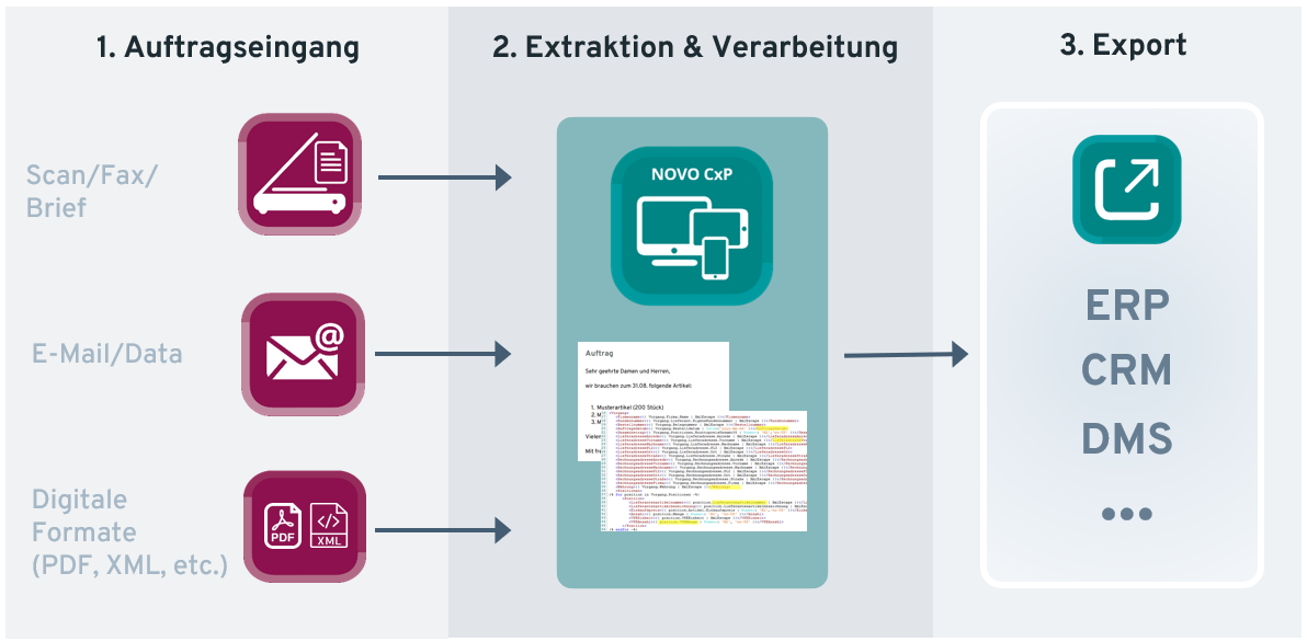 In drei Schritten übernimmt NOVO CxP die Verarbeitung Ihres Auftragseingangs: