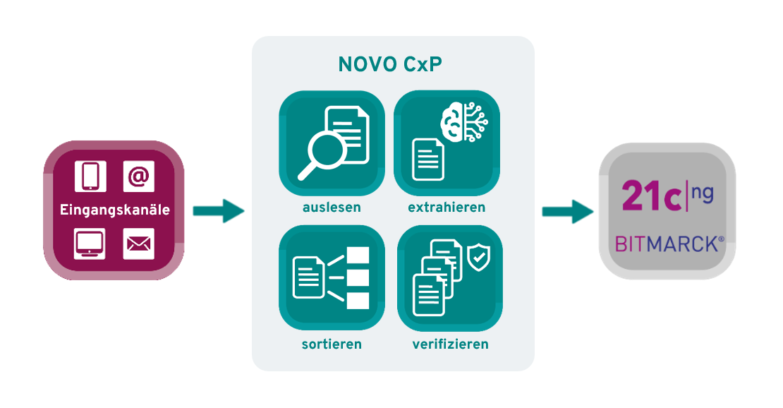 Im Zentrum steht unsere leistungsstarke Plattform NOVO CxP: Sie kombiniert künstliche Intelligenz (KI) mit modernen Technologien aus Intelligenter Dokumentenverarbeitung (IDP) und Business Process Management (BPM).