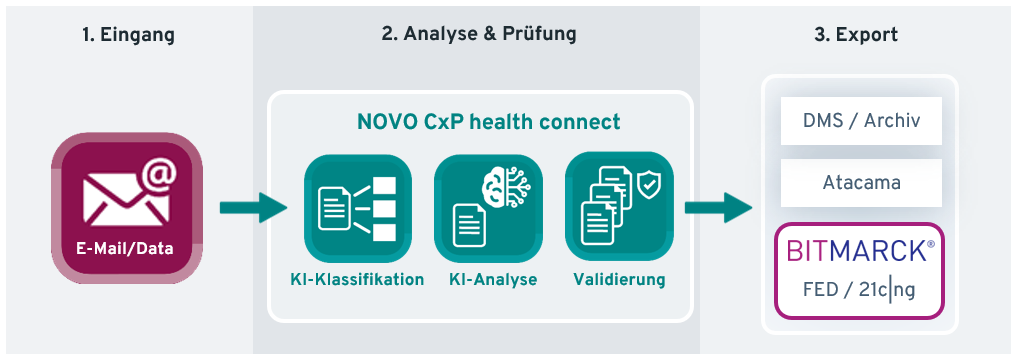 Entdecken Sie auch unsere BITMARCK-zertifizierte Lösung NOVO CxP health connect mit integrierten Standard-Schnittstellen zu Aktionssteuerung|ng, Fallakte|ng und 21c-Workflows!