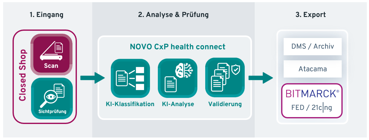 Entdecken Sie auch unsere BITMARCK-zertifizierte Lösung NOVO CxP health connect mit integrierten Standard-Schnittstellen zu Aktionssteuerung|ng, Fallakte|ng und 21c-Workflows!