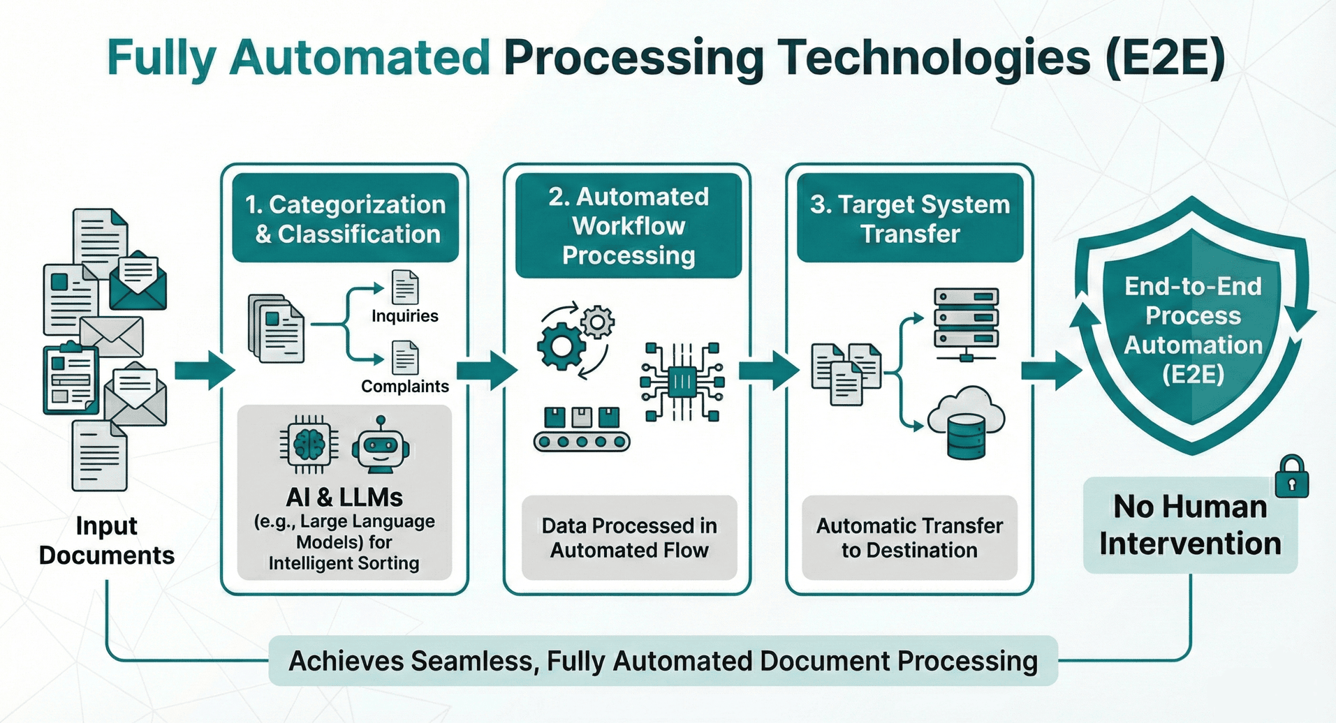 Fully automated processing relies on a mix of technologies and systems. First, the documents have to be sorted into categories (such as inquiries, complaints, etc.). For some use cases, new AI technologies such as LLMs are increasingly being used. After this classification step, the data is processed in an automated workflow and then automatically transferred to the target system. If all these steps are carried out without human intervention, this is referred to as fully automated processing or End-to-End Process Automation.