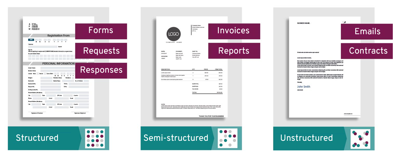 Unstructured data | PDFs, scans, letters, free text fields, contracts |